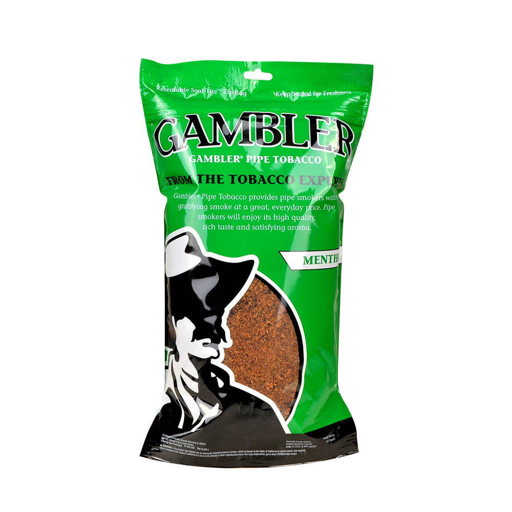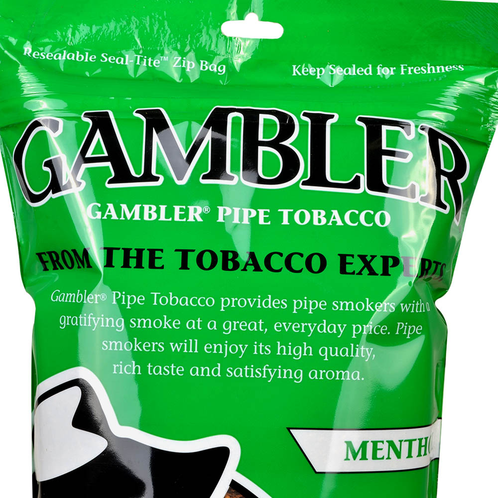 A minty taste so cool and refreshing will leave your senses in a world of bliss. Introducing the Gambler Pipe Tobacco Menthol blend. a product made of the finest combination of Burley and Virginia tobaccos. hand selected so one can be ensured that they have reached a state of perfection. This non aromatic smoke is Ribbon cut in order to facilitate an even. consistent smoke when placed into a pipe or rolled into rolling paper. With a balanced flavor intensity. you can rest assured that your minty smoke will not be too harsh or overpower – your senses will feel a rush that is just right. Once ignited. the smoke is medium in strength. yet the room note remains low – a perfect combination that leaves those in the immediate surroundings at peace with your smoke and your senses at peace as they taste the freshening flavor. Gambler Menthol Pipe Tobacco comes in 6oz and 16oz bags accordingly. each sealed in resealable Zip-Tie bags that guarantee the preservation of freshness and quality for a long time after they are opened.