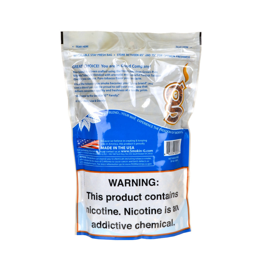 Produced for the aficionado by Tobacco Outlet Express. LLC on farms that are domestic in the United States each pipe tobacco blend is double packaged into pouches that are crafted for an optimal preservation of freshness and quality. Designed with a plastic window. which allows for the consumer to preview the product prior to purchasing it Smokin’ G continues to show off confidence in their products.